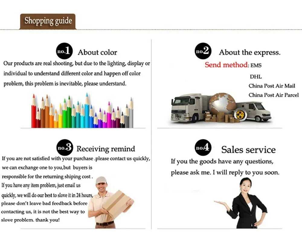 2. Ако получените от вас продукти са повредени или с грешен стил, моля, не оставяйте отрицателни отзиви, а се свържете с нас, ние ще се погрижим за това и ще намерим най-добрите решения. Вашето удовлетворение е наш стимул да се справяме по-добре.